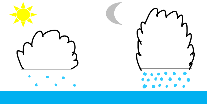 These nighttime processes are different to the daytime. In particular, stratocumulus clouds are known to rain more during the nighttime. This is because when there is less sunlight warming the top of the cloud it can grow thicker, and it is therefore more likely that a cloud droplet will grow big enough to fall out of the cloud as rain.