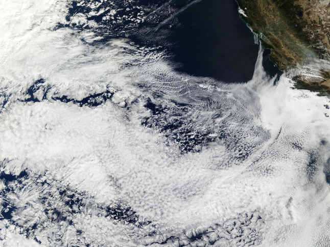 Stratocumulus clouds, off the coast of California viewed from space. They are very bright compared with the dark ocean below making them highly efficient reflectors of solar radiation. You can see the multiday break up as it gets less cloudy further away from the coast (NASA)
