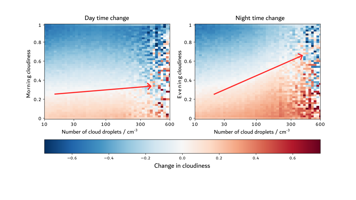 The red arrow below shows the point at which cloudiness goes from increasing to decreasing (red to blue). During the nighttime this is much more sensitive to the number of cloud droplets compared with the daytime (highlighted by steepness of the line; Pugsley et al, 2025