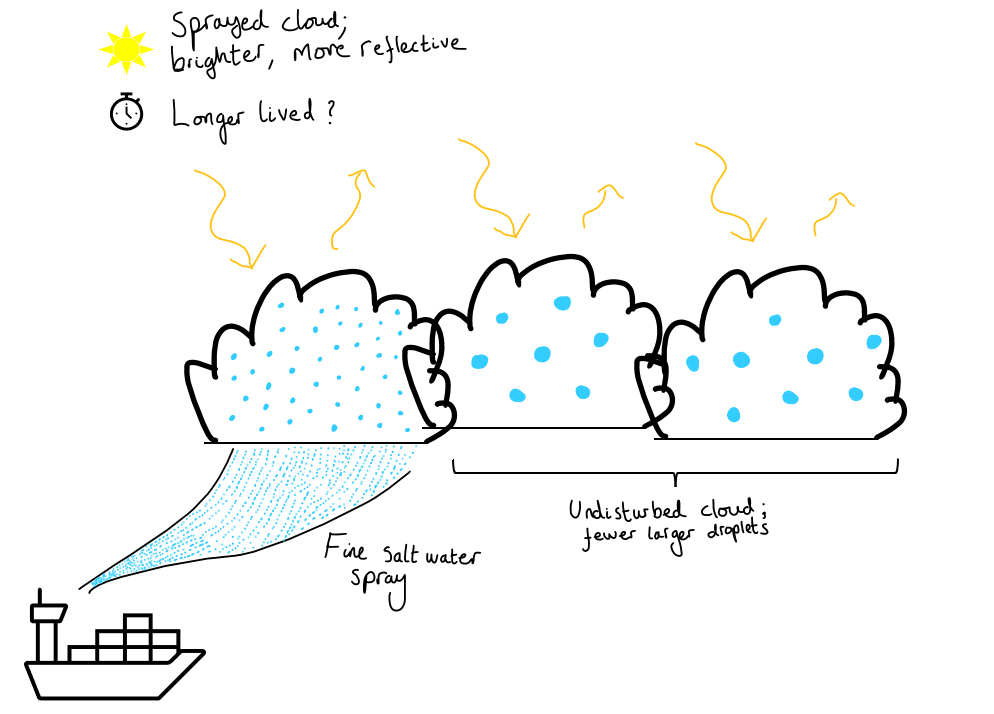 Spraying a fine salt mist into clouds may increase the brightness and lifetime, but the strength of this effect will depend on the time of day.