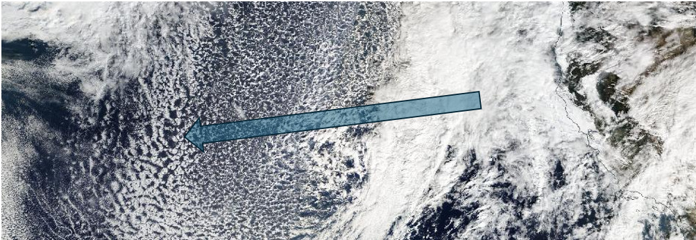Stratocumulus clouds over the north-east Pacific breaking up as they travel further west (left) away from the coast (NASA)